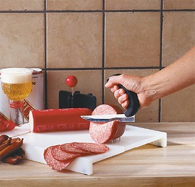 ・片手でも調理できるように固定装置が付いたまな板です。底面には吸盤が付いていますので机や台所にもしっかり固定されます。