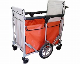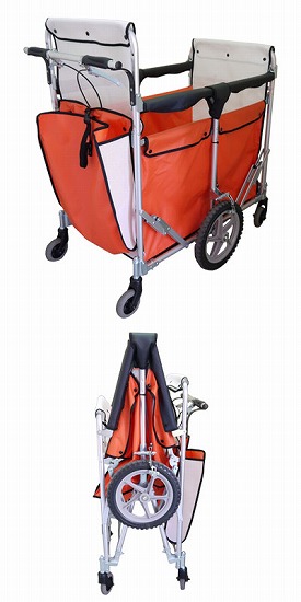 ・折りたたみタイプの軽量中型お散歩カー。防炎シートやノーパンクタイヤが標準装備。また、底床タイプで底板も折りたためるようになりました。