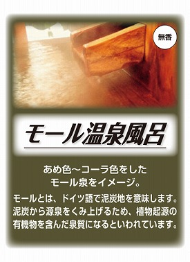 ・あめ色〜コーラ色をしたモール泉をイメージ。モールとは、ドイツ語で泥炭地を意味します。泥炭から温泉をくみ上げるため、植物起源の有機物を含んだ泉質になるといわれています。